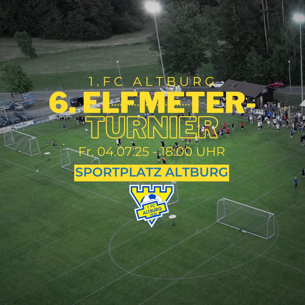 Wir freuen uns, 48 Mannschaften am Fr. 04.07.25 zu unserem Elfmeterturnier begrüßen zu dürfen. Anpfiff ist um 18:00 Uhr auf dem Sportplatz in Altburg. Die Anmeldegebühr in Höhe von 40€ muss bis spätestens 30 Minuten vor beginn des Turniers bei der Turnierleitung beglichen werden.  Turnierplan und weitere Informationen werden per Mail an die Teams verschickt.