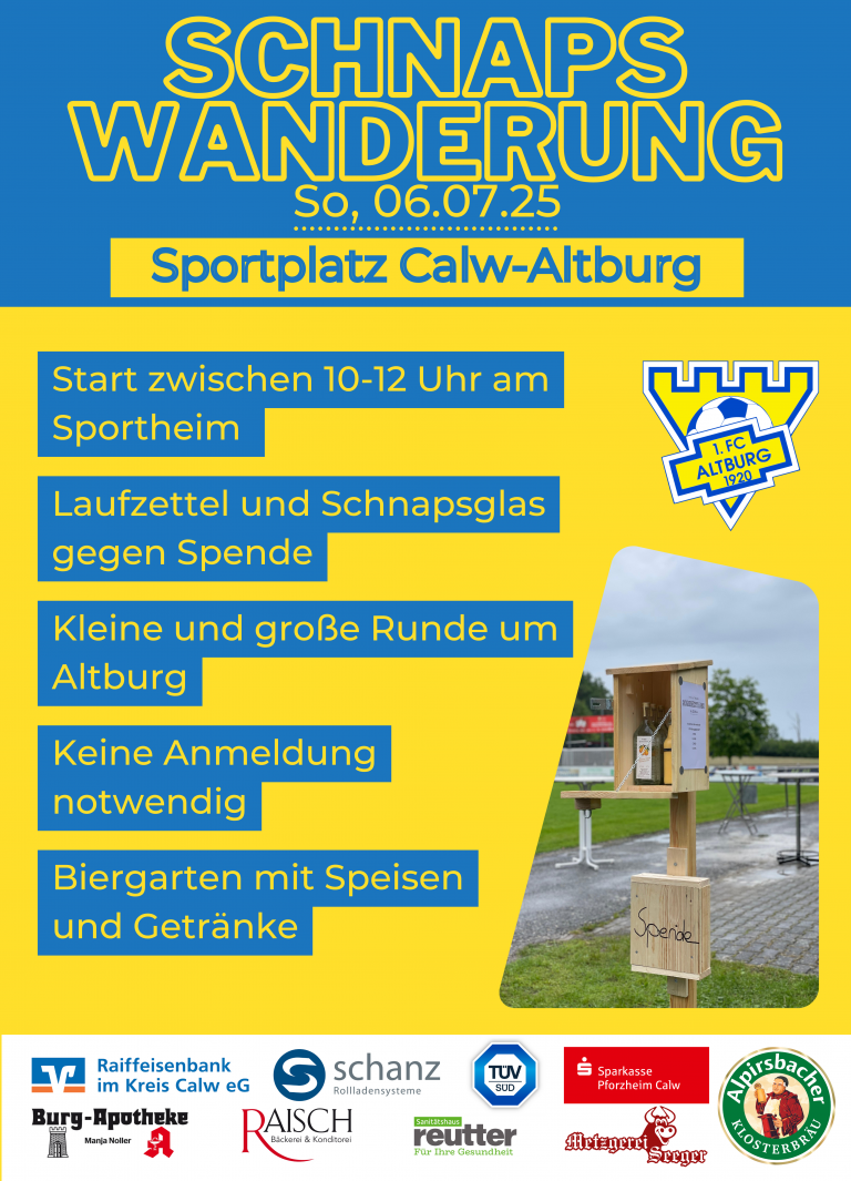 Ab 10 – 12 Uhr kann man alleine oder als Gruppe vom Sportheim Altburg aus starten, dort bekommt man zu Beginn ein Schnapsglas und einen Laufzettel mit der Route für die 5 verschiedenen Schnapsstationen. Die Schnapsstationen sind bis 15 Uhr für euch aufgebaut, damit auch die letzten Wanderer ausreichend Zeit für Ihre Wanderrunde haben. An jeder Schnapsstation befindet sich eine Frage, deren Lösung die Zahlenkombination für das Vorhängeschloss ist. In den Kästen befindet sich jeweils eine Sorte Schnaps und eine Sorte Likör (für diejenigen, die keinen Schnaps mögen), an denen sich in angemessenem Maße bedient werden darf, sodass jeder die Chance auf einen Schnaps bekommt. Anschließend bitten wir darum, den Kasten für die nächste Gruppe wieder mit dem Zahlenschloss zu verschließen. Wir bitten um einen verantwortungsbewussten Umgang!